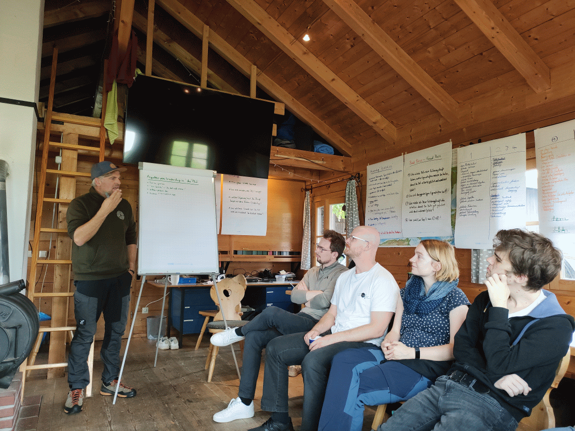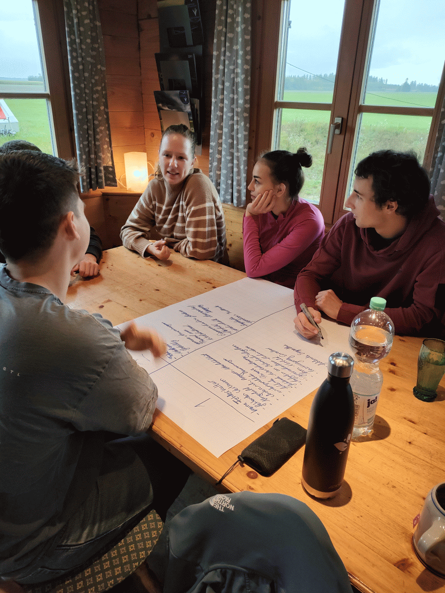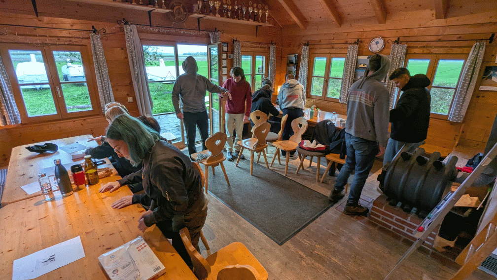 Uns begrüßte unser Seminarleiter Janik Eggler, ein Segelfluglehrer und Führungscoach und nach einer kurzen Brotzeit startete das Seminar. Am Anfang stellten wir uns ausführlich vor und danach folgte direkt eine praktische Übung: Eine Person bekam die Augen verbunden und sollte von einer anderen durch einen Parcours geführt werden. Schon dabei wurde deutlich, wie herausfordernd gute Führung sein kann und wie viel Vertrauen, Kommunikation und Klarheit sie erfordert. An den Abenden gab es dann zusammen Essen und auch der Aufenthalt in der kleinen Blockhütte, stärkte den Zusammenhalt der Gruppe, wie eine Teilnehmerin lachend feststellte. Wir wurden schnell ein gutes Team, was uns besonders am nächsten Tag geholfen hat.